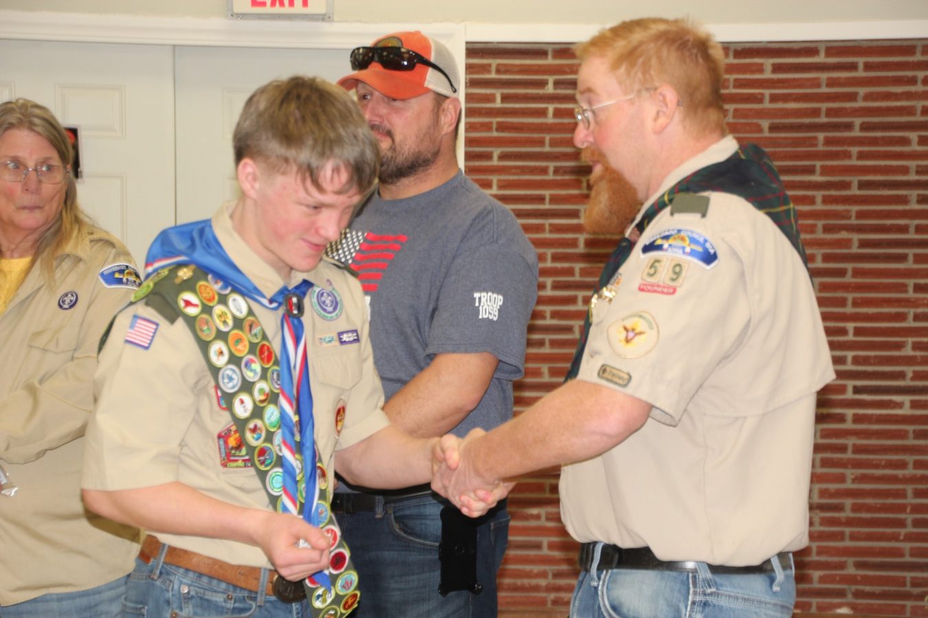 Scoutmaster Rick Dawson, who has guided both young men throughout their scouting careers, reflected on their accomplishments. “The proof is in the Scout,” Dawson said in his speech. “This is the way they act. This is the way they hold themselves … A real scout is a person who CAN and IS and DOES. The CAN is in the skills that the person (has). A scout CAN find their way through the woods. A scout CAN make fire in torrential downpour rains. A scout CAN give first aid. A scout IS part of something bigger. A Scout IS (under) the Scout Law. A scout IS trustworthy, loyal, helpful, friendly, courteous, kind, obedient, cheerful, thrifty, brave, clean, and reverent.” What a scout does, Dawson said, is embodied in the Scout Law, and the Scout Motto, “be prepared,” and “on my honor, I will do my best.” He lauded both scouts for embodying these values. “The uniform isn’t what makes a scout,” Dawson noted, “it is the scout inside the uniform.”