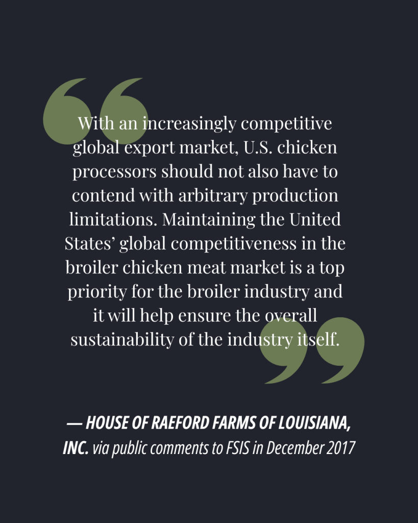 In the letters, industry groups — including the Ohio Poultry Association, the Indiana State Poultry Association, Wayne-Sanderson Farms (then Wayne Farms) and House of Raeford Farms — celebrated the petition as a step forward in “promoting and enhancing FSIS inspection procedures” and “increasing industry efficiency.”
