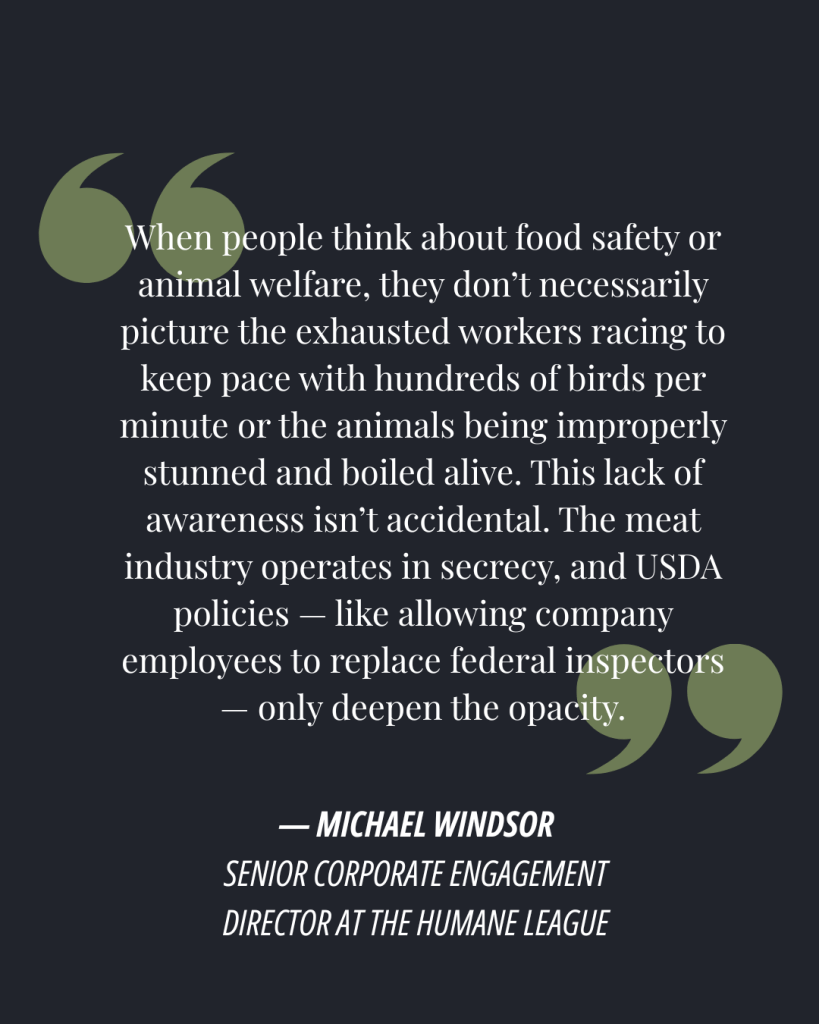 “When people think about food safety or animal welfare, they don’t necessarily picture the exhausted workers racing to keep pace with hundreds of birds per minute or the animals being improperly stunned and boiled alive,” Windsor wrote. “This lack of awareness isn’t accidental. The meat industry operates in secrecy, and USDA policies — like allowing company employees to replace federal inspectors — only deepen the opacity.”