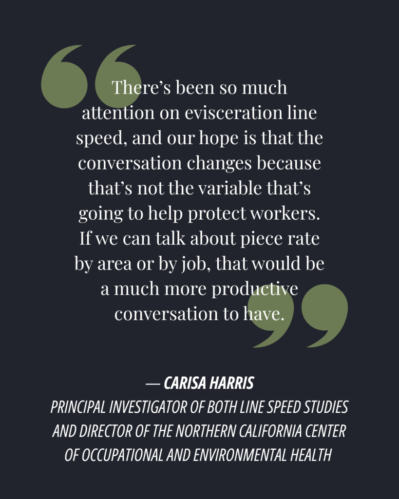 According to Carisa Harris — principal investigator of both studies and director of the Northern California Center of Occupational and Environmental Health — evisceration line speeds aren’t the main determinant of worker safety.