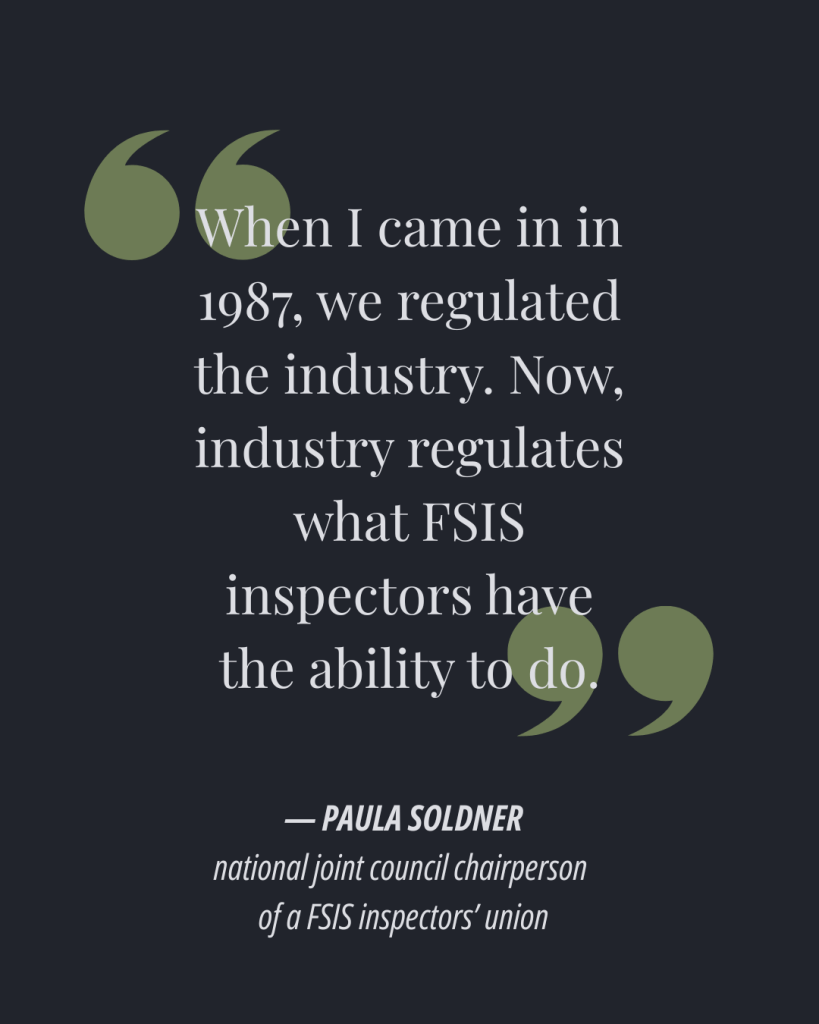 Soldner, who worked as a FSIS inspector for 32 years prior to her full-time role at the inspectors’ union, said this window wasn’t nearly enough time for federal inspectors to spot hazards — even if private employees had already reviewed the carcasses.
