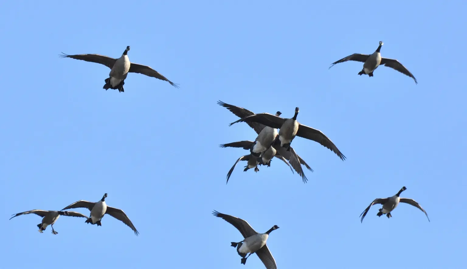 eventually spotted the birds – a line of eleven honkers moving across the landscape in a southerly direction. When I fired off a greeting, the birds turned. As the flock drew closer, their calls became more frequent and there was an obvious