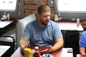 “You look back at my life, and you look at my dad just trying to put food on the table, and you realize, and this is when I start getting very angry, you realize very quickly that the rich are getting richer, the poor are getting poorer, and most of us are literally fighting over the scraps,” Sage said. “They have us divided and fighting over the scraps. When 60% of our population is living paycheck to paycheck, and 60% of our population doesn’t even meet the minimum quality standard of a country as rich as ours, something is entirely wrong. And the way I look at it is Washington D.C. is made up of 98% generational wealth, and only 2% come from the working class. The reason the laws and things are not working our way, are going our way, is because the people that are there are there to make profits over people. They’re backed by corporations. They’re backed by billionaires. They’re backed by people that don’t give a crap about anybody in this diner. And I think that’s inherently wrong. We have to do something about it. So I, standing up and fighting for our country three times in Iraq, sitting on the yellow footprints at MCRD San Diego, taking an oath and saying ‘I swear to defend and support the Constitution against enemies, foreign and domestic,’ and I meant it. I’m here to fight. I’m the candidate in this that was willing to lay down my life for this country. I think that’s what we need more than anything in this world. We need people willing to fight for Iowans. Fight for us, instead of the corporations and the billionaires and the money.”
