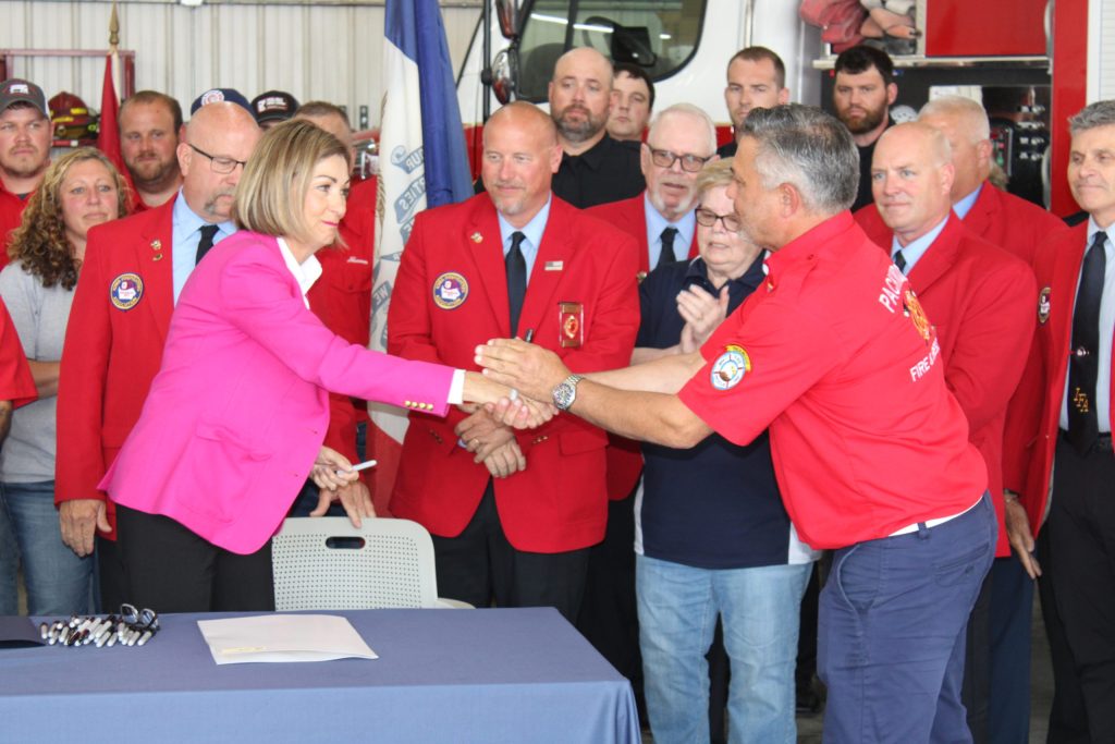 PACKWOOD – HF1002, a bill designed to help volunteer fire departments retain and recruit members, was signed into law by Iowa Governor Kim Reynolds at the Packwood Fire Department on June 3, as the governor was surrounded by firefighters from Packwood and surrounding communities.
