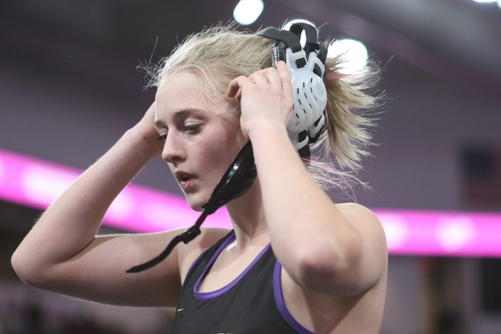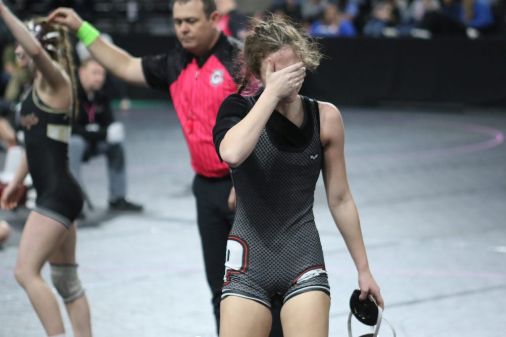 Sadie Clarahan started off her State tournament against an Assumption opponent. Clarahan was able to get two escapes in the match, but she was defeated 8-2.