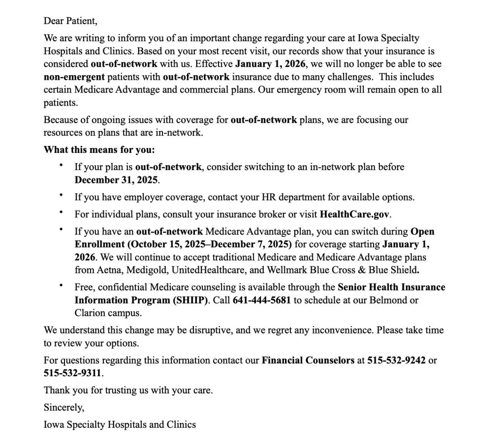 Iowa Specialty CEO Steve Simonin said the hospital is preparing to notify patients about which plans will no longer be accepted, some Advantage plans will still be accepted. “We are planning on sending a letter via MyChart to all of our patients discussing which Medicare Advantage plans we don’t accept,” he told The Wright County Monitor.